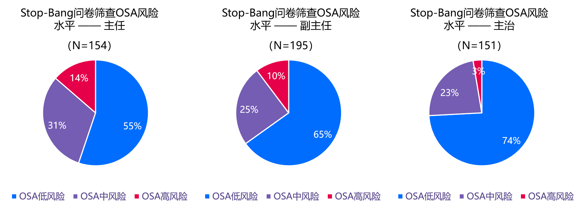 职业特性带来的健康负担,让医生成为 OSA 的高危人群。报告显示,超 40% 的医生存在 BMI 超重问题——而超重正是 OSA 的核心风险因素之一。风险筛查数据更令人警惕:约三成医生处于 OSA 中风险,一成处于高风险,其中主任医师的高风险比例尤为突出。这一结果与 “88% 医生患有职业病” 的行业现状2形成呼应,揭示了医生群体健康管理的迫切性。