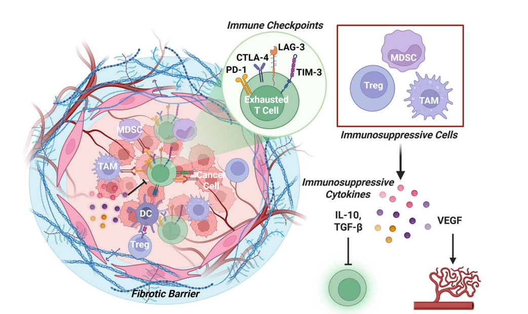 HCC的免疫微环境具有高度的免疫抑制特性,主要表现为细胞毒性CD8+ T细胞的功能性耗竭,伴随PD-1、CTLA-4、LAG-3、TIM-3等多重免疫检查点的表达上调。此外,调节性T细胞(Tregs)、骨髓来源抑制细胞(MDSCs)和肿瘤相关巨噬细胞(TAMs,尤其是M2型)大量浸润,分泌IL-10、TGF-β等抑制性细胞因子,加剧免疫逃逸。肿瘤间质的纤维化重塑则形成物理屏障,阻碍免疫细胞进入肿瘤内部,进一步限制免疫治疗效果。