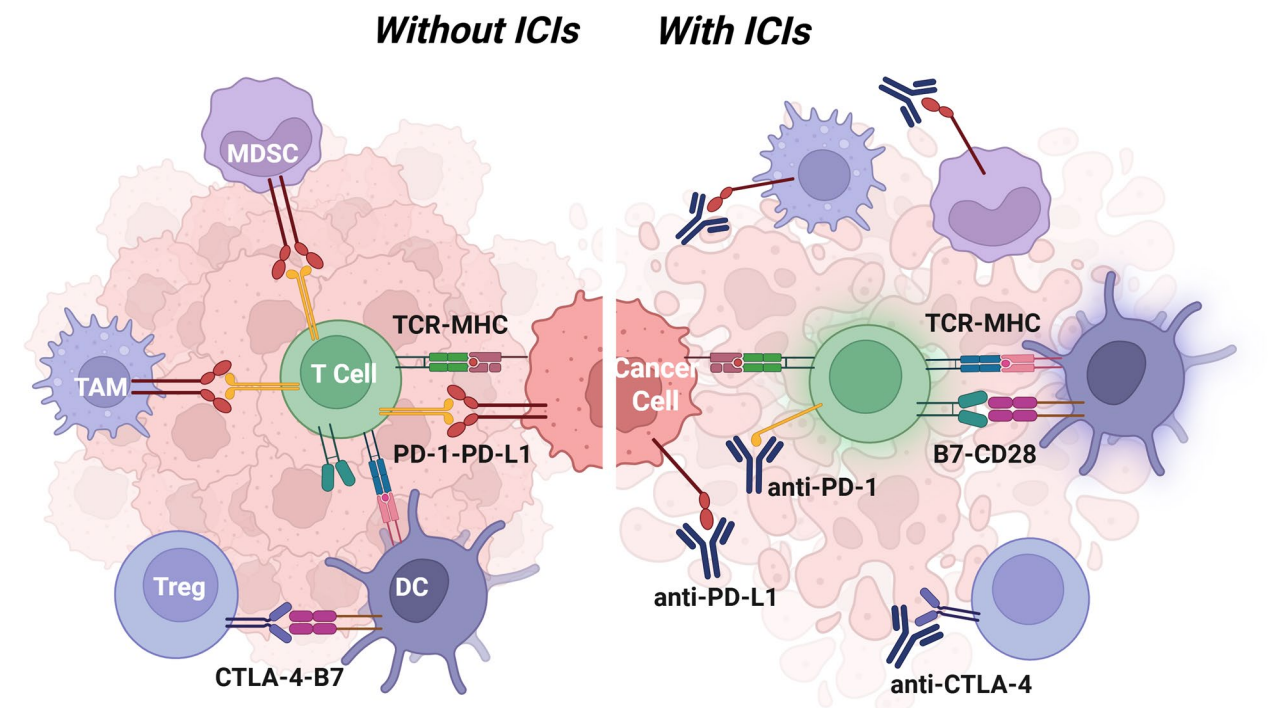 ICIs通过阻断PD-1/PD-L1和CTLA-4信号通路,恢复T细胞活性,逆转细胞功能耗竭,从而促进抗肿瘤免疫反应。PD-1抑制剂(如纳武利尤单抗nivolumab、帕博利珠单抗pembrolizumab)解除T细胞抑制,增强细胞毒活性。CTLA-4抑制剂(如伊匹单抗ipilimumab、曲美木单抗tremelimumab)主要促进初始T细胞活化和抗原递呈,减少Tregs介导的免疫抑制。尽管单药ICIs疗效有限,但它们可通过减弱免疫抑制细胞,增加效应性CD8+ T细胞浸润,对肿瘤产生免疫调节作用。
