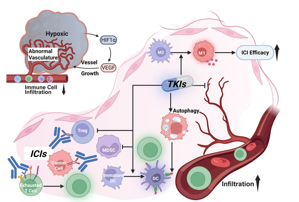 HCC肿瘤高度血管化,异常的血管生成导致肿瘤缺氧,促进免疫抑制。TKIs如仑伐替尼(lenvatinib)、卡博替尼(cabozantinib)通过抑制VEGF信号,部分恢复肿瘤血管正常化,缓解缺氧,促进免疫细胞浸润,同时抑制MDSCs和Tregs的积累,减少免疫抑制性细胞因子(IL-10、TGF-β)水平。此外,TKIs可促进树突状细胞(DCs)成熟,增强抗原递呈,提高T细胞激活。TKIs还能抑制MET、AXL等与肿瘤侵袭和免疫逃逸相关的通路。临床试验如IMbrave150、ORIENT-32、CARES-310和CheckMate 040 cohort 6均证实了ICIs与TKIs联合的临床获益。