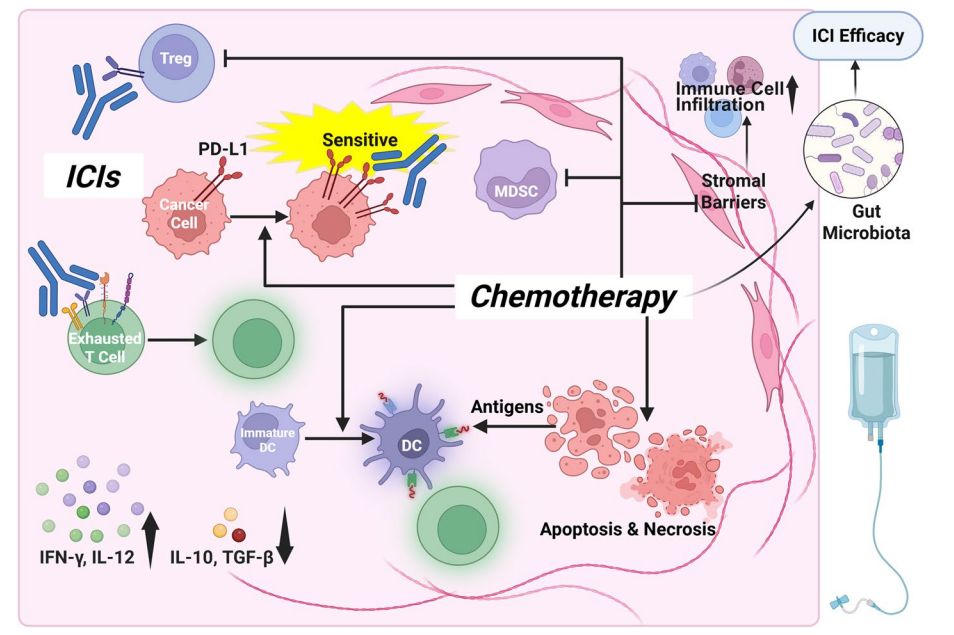 部分化疗药物可诱导免疫原性细胞死亡(ICD),释放肿瘤相关抗原和危险信号,激活DCs和效应性T细胞。药物如奥沙利铂(oxaliplatin)、5-氟尿嘧啶(5-FU)、多柔比星等可减少MDSCs和Tregs,改变免疫微环境,提升免疫治疗效果。化疗还可以重塑肿瘤间质,降低纤维化,促进免疫细胞渗透。临床研究显示,ICIs与化疗联合治疗可提高肿瘤缓解率,安全性可控,但不同药物和剂量对免疫影响存在差异,需进一步优化方案。