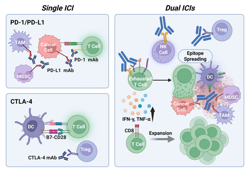 PD-1/PD-L1与CTLA-4在T细胞活化的不同阶段发挥抑制作用。双重阻断能同时增强T细胞初始激活和恢复效应细胞功能,促进更持久的抗肿瘤免疫。临床试验如CheckMate 9DW和HIMALAYA支持双免疫检查点联合治疗具有更高疗效,但免疫相关不良事件较单药多,需合理调整给药方案。新一代双特异性抗体正在研发,以期降低毒性,提高选择性。