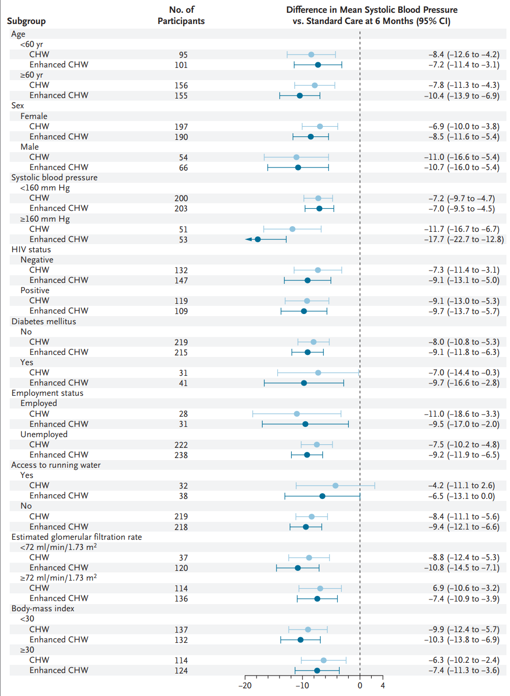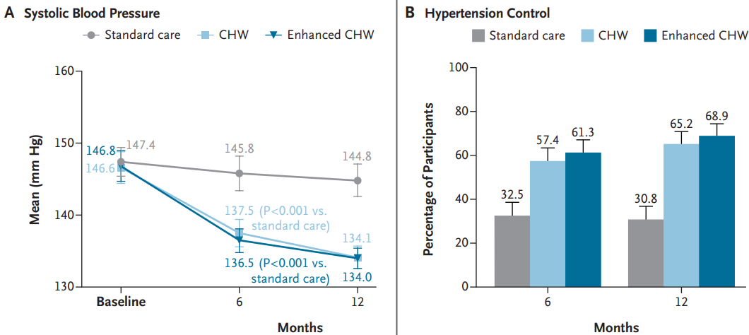 结果显示,参与者平均年龄62岁,76%为女性,46.5%合并HIV感染,13.6%患有糖尿病。6个月时,CHW组和增强CHW组的平均收缩压分别较标准护理组低7.9 mmHg和9.1 mmHg(均P<0.001)。高血压控制率方面,标准护理组32.5%,CHW组57.4%,增强CHW组61.3%。这些差异在12个月时仍显著存在。严重不良事件和死亡率在各组间无显著差异,且超过95%的CHW组患者保持随访依从。