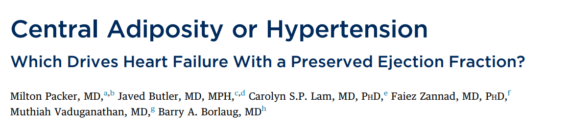 Packer M, Butler J, Lam CSP, Zannad F, Vaduganathan M, Borlaug BA. Central Adiposity or Hypertension: Which Drives Heart Failure With a Preserved Ejection Fraction?. J Am Coll Cardiol. Published online October 1, 2025. doi:10.1016/j.jacc.2025.08.036