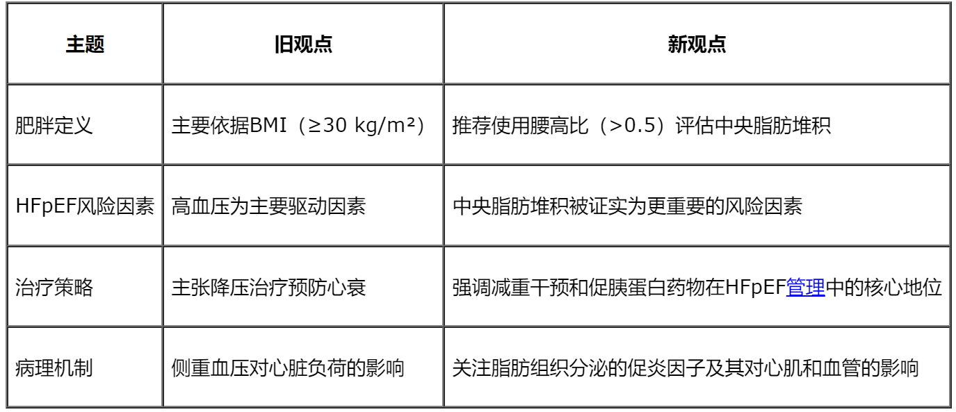 中央脂肪堆积的评估优于BMI:传统依赖体质指数(BMI)来定义肥胖可能低估了脂肪过多的患者。腰围与身高比(waist-to-height ratio,>0.5)被推荐作为识别中央脂肪堆积的更可靠指标,与HFpEF风险密切相关。