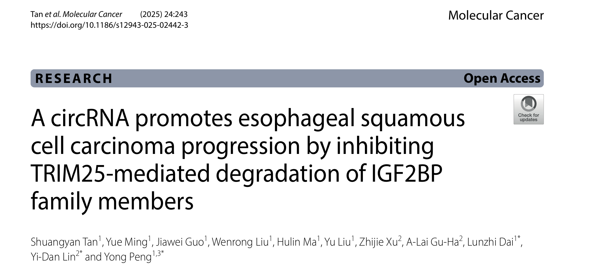 Tan, S., Ming, Y., Guo, J. et al. A circRNA promotes esophageal squamous cell carcinoma progression by inhibiting TRIM25-mediated degradation of IGF2BP family members. Mol Cancer 24, 243 (2025). https://doi.org/10.1186/s12943-025-02442-3