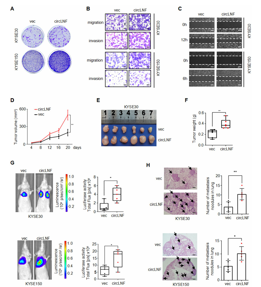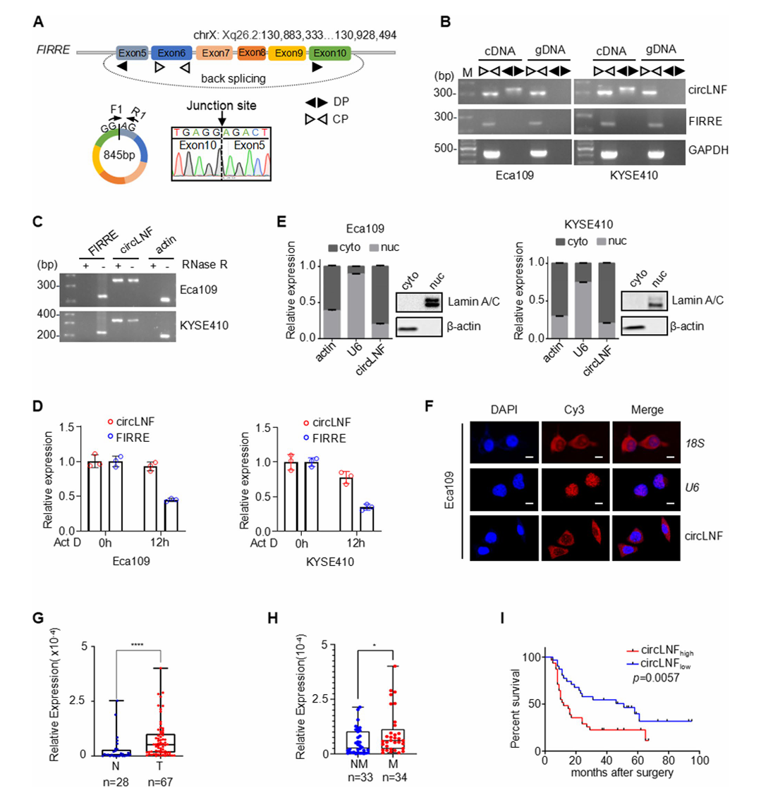 食管鳞状细胞癌(ESCC)是中国高发的恶性肿瘤类型,约占所有食管癌病例的百分之九十,其五年生存率极低,临床治疗手段有限,预后普遍较差。近年来,非编码RNA在肿瘤发生发展中的作用逐渐成为研究热点,其中环状RNA因其闭合环状结构而具有较高的稳定性,在多种癌症中表现出显著的表达异常,并参与调控肿瘤细胞的增殖、侵袭与转移等恶性行为。然而,在食管鳞癌中,大多数环状RNA的具体功能及其作用机制仍不明确。本研究团队前期通过转录组测序建立了ESCC中环状RNA的表达谱,并发现多个候选分子可能参与疾病进程,其中来源于长链非编码RNA FIRRE基因的环状RNA——circLNF,在肿瘤组织中表达显著上调,但其在ESCC中的生物学功能及调控网络尚待阐明。