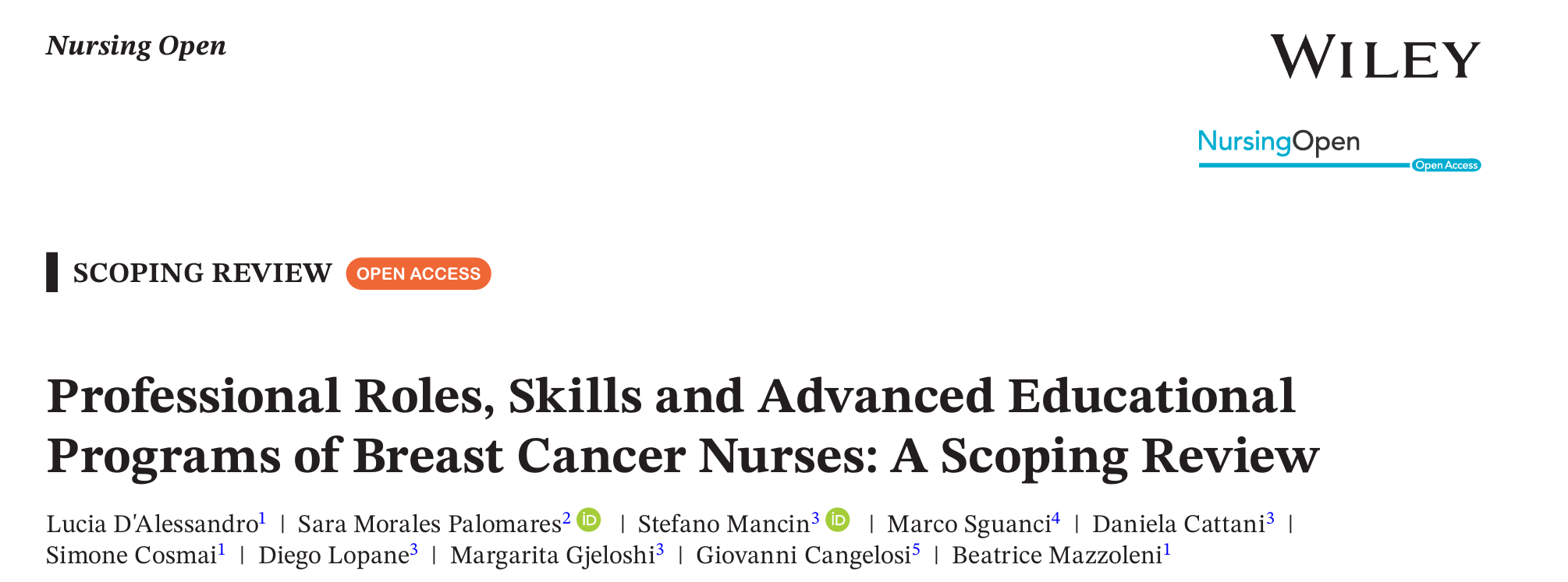 D'Alessandro, L., Morales Palomares, S., Mancin, S., Sguanci, M., Cattani, D., Cosmai, S., Lopane, D., Gjeloshi, M., Cangelosi, G., & Mazzoleni, B. (2025). Professional Roles, Skills and Advanced Educational Programs of Breast Cancer Nurses: A Scoping Review. Nursing Open, 12, e70251. https://doi.org/10.1002/nop2.70251