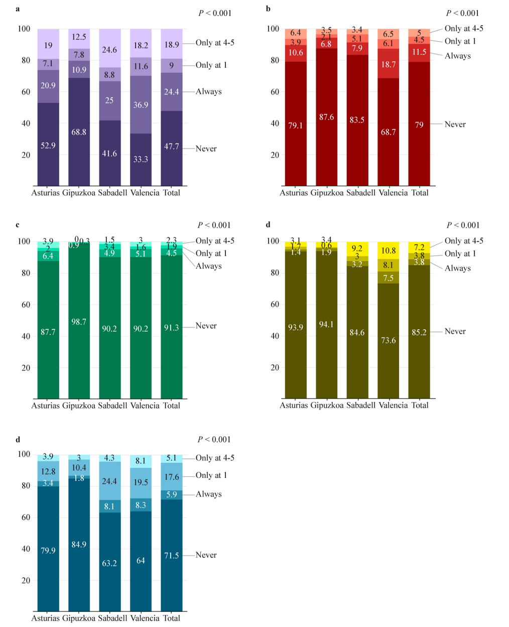 研究人员纳入INMA项目中1893个家庭,研究涵盖四个地区(瓦伦西亚、萨瓦德尔、阿斯图里亚斯和吉普斯夸)。养宠物信息通过访谈收集,涵盖五类动物:任意宠物、狗、猫、鸟及其他(小型哺乳类、鱼类、爬行动物等)。养宠状态按“从未”、“一直有”、“仅1岁时有”、“仅4-5岁时有”分类。心理健康通过父母填写的SDQ评估,主要关注内化和外化两大行为问题评分。采用负二项回归模型分析养宠与心理健康的关联,调整多种混杂因素,辅以Tukey多重比较和多项敏感性分析。