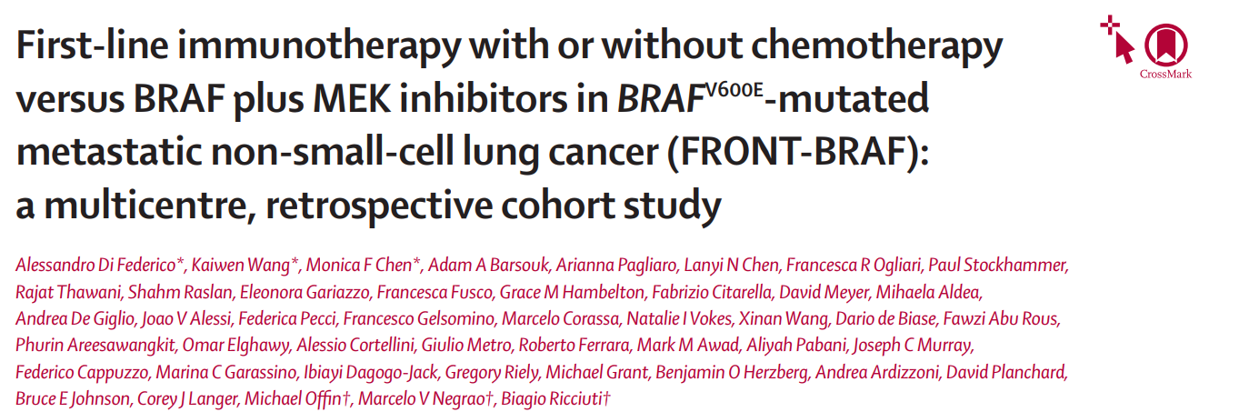 Di Federico A, Wang K, Chen MF, et al. First-line immunotherapy with or without chemotherapy versus BRAF plus MEK inhibitors in BRAFV600E-mutated metastatic non-small-cell lung cancer (FRONT-BRAF): a multicentre, retrospective cohort study. Lancet Oncol. 2025;26(10):1357-1369. doi:10.1016/S1470-2045(25)00409-7