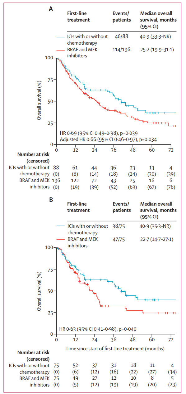 结果显示,284例中,31%接受ICIs±化疗,69%接受BRAF+MEK抑制剂。ICIs组患者吸烟史更多(83% vs 60%)且PD-L1高表达(≥50%为66% vs 39%)。中位随访45个月,ICIs组中位OS为40.9个月,显著优于BRAF+MEK组的25.2个月(HR=0.69,p=0.039)。