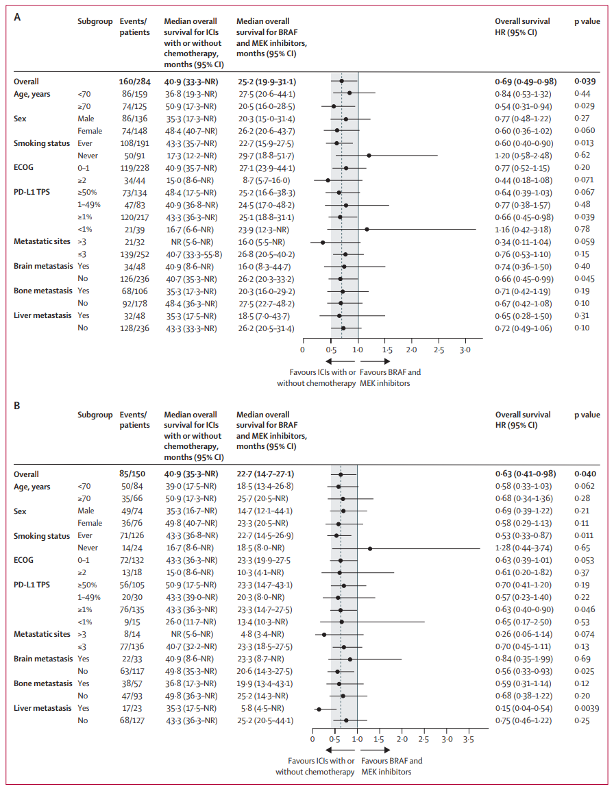 非小细胞肺癌(NSCLC)中约1-3%的患者携带BRAF V600E(Val600Glu)突变。尽管其发生率较低,但其临床表现与其他驱动基因突变肿瘤不同,患者更常有吸烟史,PD-L1表达及肿瘤突变负荷较高。针对这类肿瘤,现有治疗方案主要包括BRAF与MEK抑制剂的靶向治疗,或免疫检查点抑制剂(ICIs)单药或联合化疗。BRAF和MEK抑制剂组合显示出较高的客观缓解率,但总体生存优势不明确。当前NCCN和ESMO指南推荐BRAF+MEK抑制剂作为首选一线治疗,但免疫治疗在部分人群中表现出潜在优势,尚需进一步研究验证。本研究为多中心、回顾性队列分析,首次系统比较了这两种一线治疗在BRAFV600E突变转移性NSCLC患者中的疗效,并分析了不同临床及分子亚组患者的治疗获益差异。