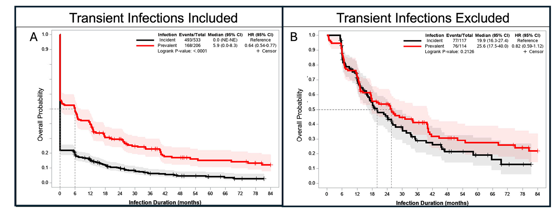 经过系统分析,研究共识别出589名存在口腔HPV感染的男性,其中403名为事件感染,186名为流行感染,中位随访时间达到44.8个月。在整个观察期间,共记录了739次致癌型口腔HPV感染事件,包括533次事件感染和206次流行感染。深入分析发现,事件感染中78%为短暂感染,仅6.6%持续超过24个月。相比之下,流行感染中47.1%为短暂感染,24.3%持续超过24个月。特别值得注意的是HPV16感染的情况,事件感染和流行感染持续超过24个月的比例分别为14.1%和21.6%。清除概率分析显示,事件感染与流行感染之间存在显著统计学差异,流行感染的清除可能性明显更低。至78个月随访结束时,超过95%的事件感染被成功清除,而流行感染的清除率仅为85%。当仅考察持续至少6个月的感染时,两类感染的清除概率无显著差异,但在18个月后,事件感染的清除概率始终高于流行感染。