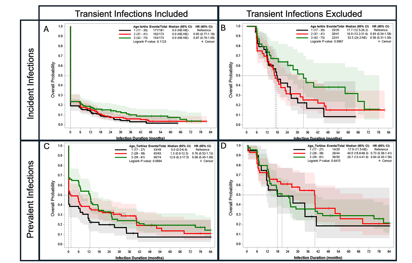 年龄因素对清除概率的影响呈现复杂特征。总体来看,各年龄组间的清除概率未见显著差异,但年长男性在两类感染中都表现出清除能力减弱的趋势。在事件感染中,持续至少6个月的感染中位持续时间呈现年龄梯度变化:17-30岁组为18个月,31-41岁组为17个月,42岁以上组延长至34个月。对于流行感染,全部感染的中位持续时间在17-27岁组不足6个月,28-38岁组为1.3个月,39岁以上组达到13个月。而在持续至少6个月的流行感染中,年轻、中年和年长组的中位感染持续时间分别为18个月、40个月和20个月。值得注意的是,国家居住地和吸烟状况在两类感染中均未对清除概率产生显著影响。