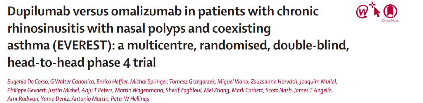 De Corso E, Canonica GW, Heffler E, et al. Dupilumab versus omalizumab in patients with chronic rhinosinusitis with nasal polyps and coexisting asthma (EVEREST): a multicentre, randomised, double-blind, head-to-head phase 4 trial. Lancet Respir Med. Published online September 28, 2025. doi:10.1016/S2213-2600(25)00287-5