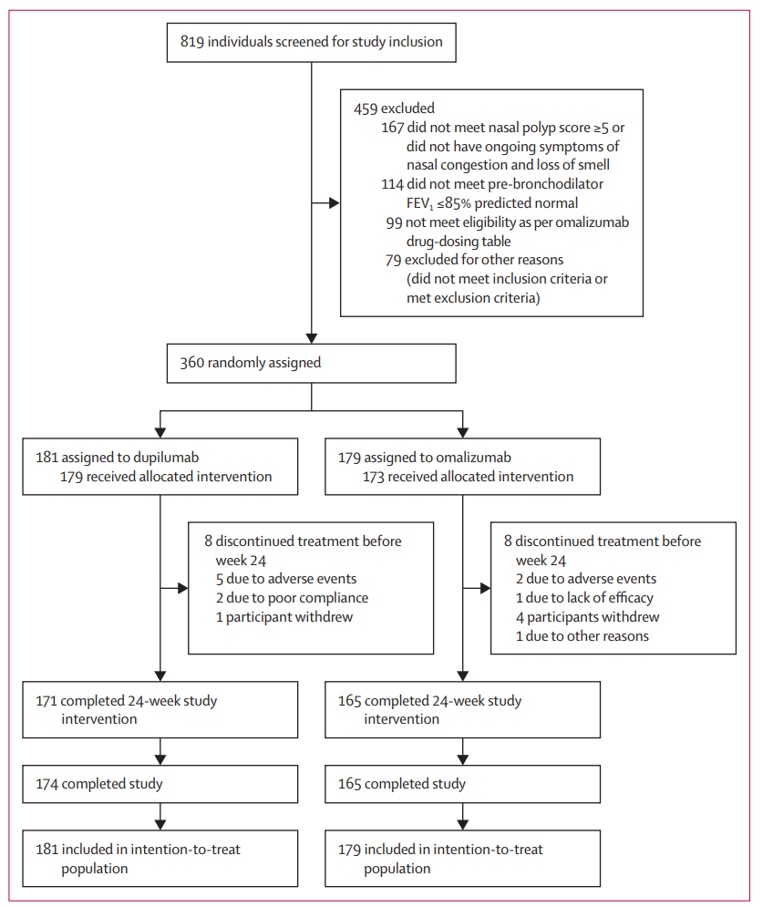 EVEREST为多中心、随机、双盲、对比Ⅳ期临床试验,于17个国家100个医疗中心开展。纳入18岁及以上,重度未控制CRSwNP(鼻息肉评分≥5且每侧鼻孔评分≥2),伴有哮喘且气道控制不稳定的患者。患者随机1:1接受每两周300mg皮下注射dupilumab或根据体重和IgE浓度分层疗法的omalizumab(每2或4周注射),两组均配合基础莫米松鼻喷雾剂治疗,疗程24周。主要终点为治疗24周后鼻息肉内窥镜评分和宾夕法尼亚大学嗅觉识别测试(UPSIT)变化。