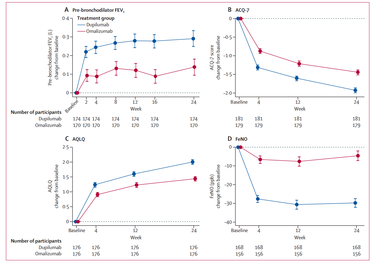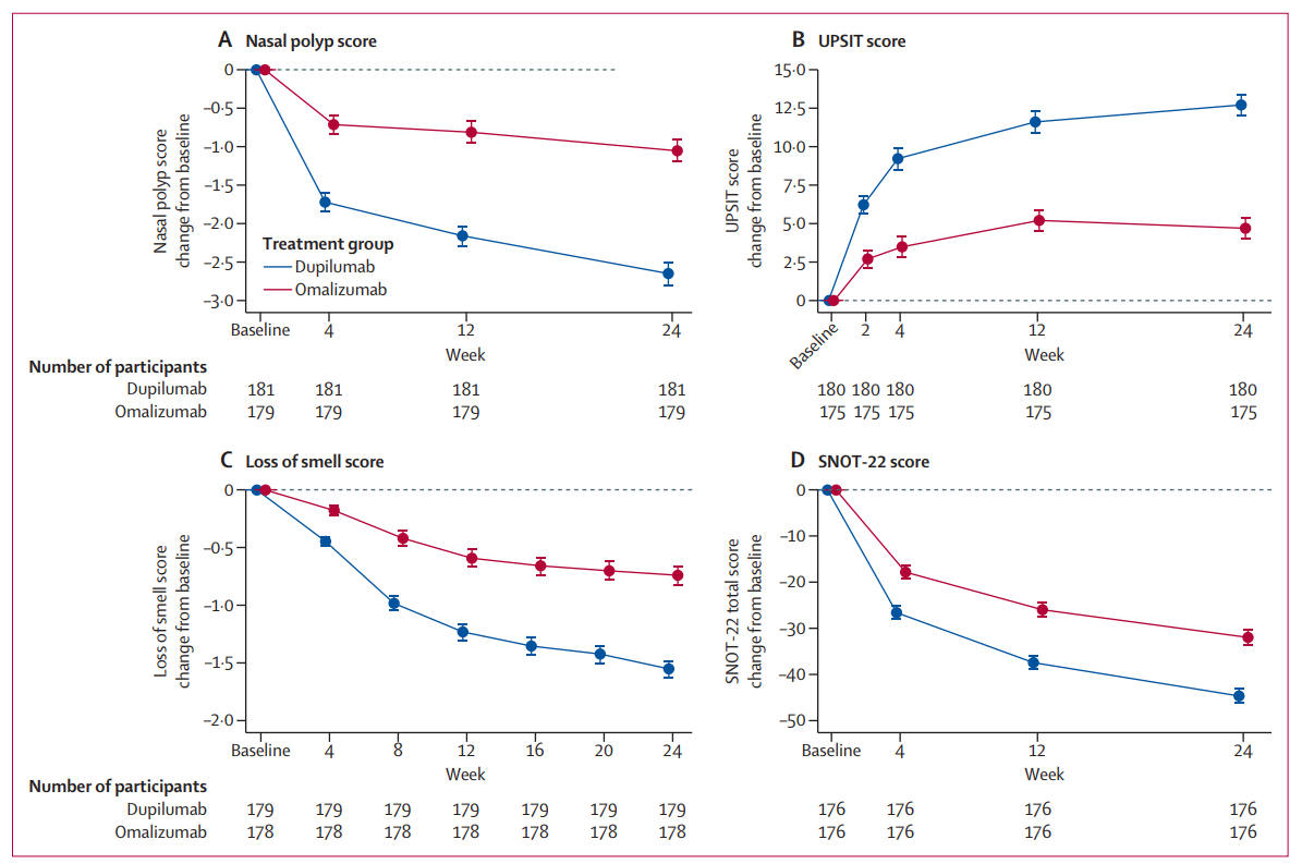 头对头 Ⅳ 期试验结果!Lancet Respir Med揭示Dupilumab 在慢性鼻窦炎伴鼻息肉合并哮喘治疗中,鼻息肉评分、嗅觉功能显著优于Omalizumab