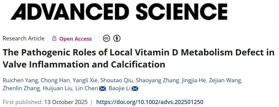 Ruichen Yang, Chong Han, Yangli Xie, Shoutao Qiu, Shaoyang Zhang, Jingjia He, Zejian Wang, Zhenlin Zhang, Huijuan Liu, Lin Chen*, and Baojie Li*. The pathogenic roles of local vitamin D metabolism defect in valve inflammation and calcification. Adv Sci. 2025 Oct 13:e01250. DOI: 10.1002/advs.202501250