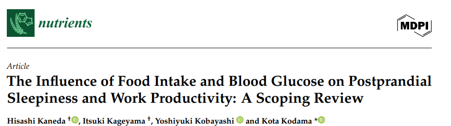 Kaneda, H.; Kageyama, I.; Kobayashi, Y.; Kodama, K. The Influence of Food Intake and Blood Glucose on Postprandial Sleepiness and Work Productivity: A Scoping Review. Nutrients 2025, 17, 3217. https://doi.org/10.3390/nu17203217