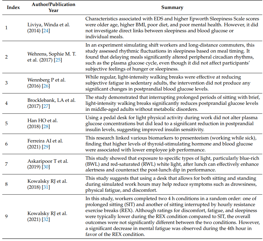 总之,当前文献中对饮食、血糖波动与工作嗜睡及生产力之间关系的研究较为有限。饮食质量与体重管理对减少EDS及提升工作表现具有潜力。餐时对生物节律调节至关重要,尤其对夜班工人影响更大。轻度间断运动虽能缓解疲劳,但对血糖波动的影响效果不一,可能因运动强度、频率及饮食标准不统一。光照干预对餐后嗜睡有积极作用,提示环境因素在工作场所管理中应获更多关注。连续血糖监测技术的普及为深入理解非糖尿病健康人群血糖与工作状态关联提供了工具。个体昼夜节律、工作性质及咖啡因摄入等因素可能作为混杂变量影响结果,未来研究需加以控制。当前研究样本量普遍较小,且缺乏同时测量血糖、嗜睡及生产力的综合研究,限制了因果推断。