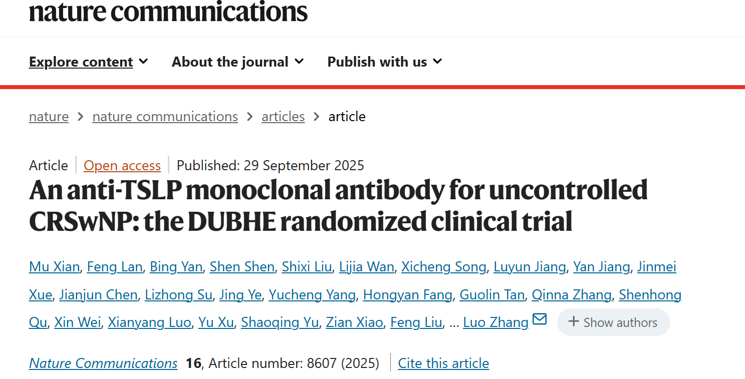 Xian, M., Lan, F., Yan, B., Shen, S., Liu, S., Wan, L., Song, X., Jiang, L., Jiang, Y., Xue, J., Chen, J., Su, L., Ye, J., Yang, Y., Fang, H., Tan, G., Zhang, Q., Qu, S., Wei, X., Luo, X., Xu, Y., Yu, S., Xiao, Z., Liu, F., Li, Q., Zhang, Y., Xie, Y., Wang, L., Yang, G., Yan, H., Zhao, G., Chen, B., Wang, C., & Zhang, L. (2025). An anti-TSLP monoclonal antibody for uncontrolled CRSwNP: the DUBHE randomized clinical trial. Nature Communications, 16, 8607. https://doi.org/10.1038/s41467-025-63682-x