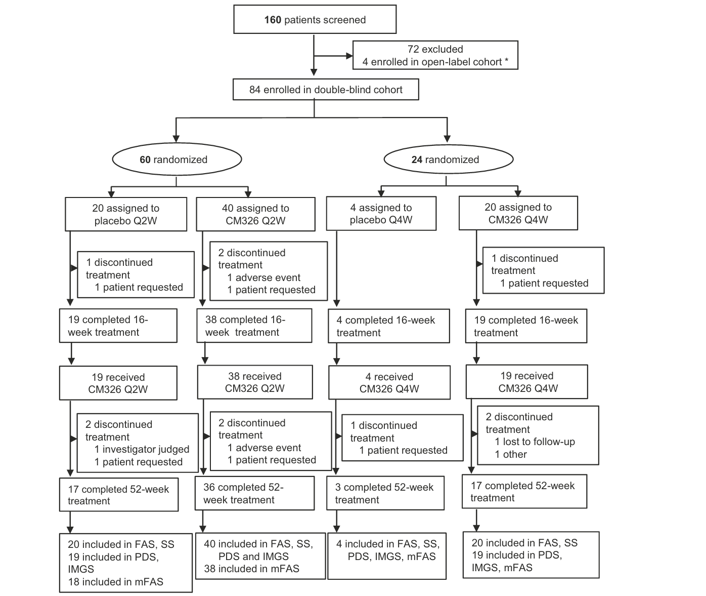 在安全性方面,CM326表现出良好的耐受性,整个研究期间所有治疗中出现的不良事件均为轻度或中度,未发生与药物相关的死亡事件。双盲治疗期内,各治疗组的不良事件发生率相近,最常见的不良事件为新冠肺炎和上呼吸道感染,这与研究期间中国新冠疫情流行背景相符。在六十四周观察期内,每两周给药组中有四例患者出现药物相关不良事件,每四周给药组中有一例,所有事件均较轻微且缓解。严重不良事件发生率较低,每两周给药组一例(肾结石和膝关节韧带损伤),每四周给药组两例(社区获得性肺炎和输尿管结石),经评估均与试验药物无关。仅有两例患者因不良事件中止治疗,一例因双盲期出现药物相关过敏性皮炎,另一例因开放标签期发生与治疗无关的原发性胆汁性胆管炎。在整个研究过程中未检测到抗药物抗体阳性,表明CM326免疫原性较低。