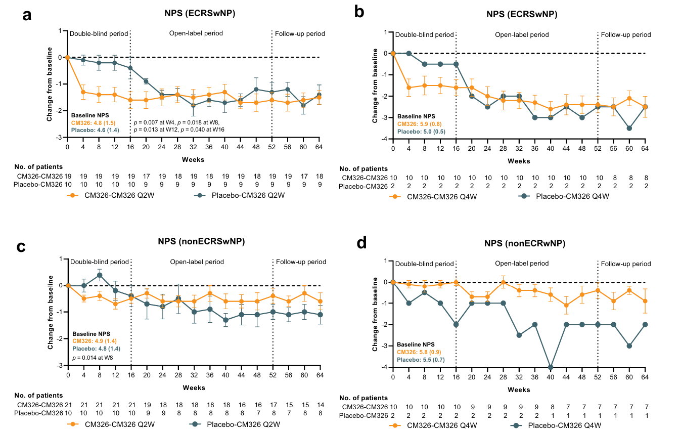 疗效结果显示,在每两周给药组中,嗜酸性慢性鼻窦炎伴鼻息肉患者接受CM326治疗后鼻息肉评分较安慰剂组显著改善,第十六周时平均差异为负一点二分,具有统计学意义,且该改善从第四周首次评估时即开始显现,并持续至开放标签期和随访期。相比之下,每四周给药组中嗜酸性慢性鼻窦炎伴鼻息肉患者虽也观察到鼻息肉评分下降趋势,但组间差异未达统计学显著性。对于非嗜酸性慢性鼻窦炎伴鼻息肉患者,无论每两周或每四周给药方案,CM326治疗均未带来鼻息肉评分的显著改善。在开放标签期,原安慰剂组患者转为CM326治疗后迅速出现鼻息肉评分下降,其改善幅度与双盲期CM326治疗组相当,且疗效在治疗结束后十二周内仍得以维持。