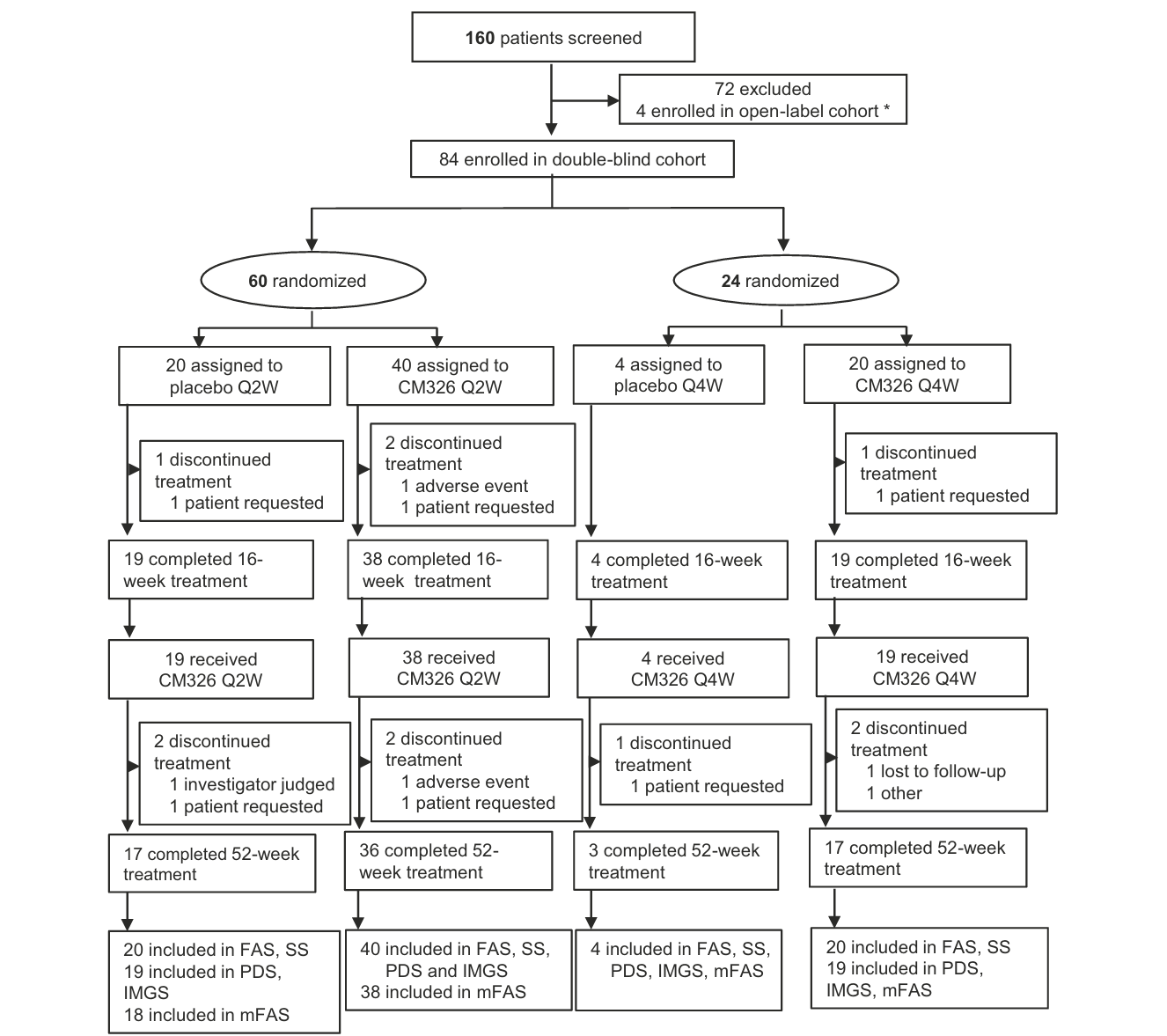 在安全性方面,CM326在Q2W和Q4W剂量组均表现出良好的安全性和耐受性,整个64周研究期间所有治疗中出现的不良事件均为轻度或中度,未报告与药物相关的死亡事件。双盲期间,各治疗组不良事件总体发生率相近,最常见不良事件为COVID-19和上呼吸道感染,其中Q2W组5例、Q4W组1例报告了与治疗相关的不良事件,均属轻度并得以缓解。严重不良事件见于Q2W组1例(单侧肾结石和膝关节韧带损伤)及Q4W组2例(社区获得性肺炎和输尿管结石),均发生于开放标签期且被判定与治疗无关。Q2W组2例患者因不良事件中止治疗,1例为双盲期内治疗相关过敏性皮炎,1例为开放标签期内与治疗无关的原发性胆汁性胆管炎。研究期间未检测到抗药抗体阳性,表明CM326免疫原性较低。