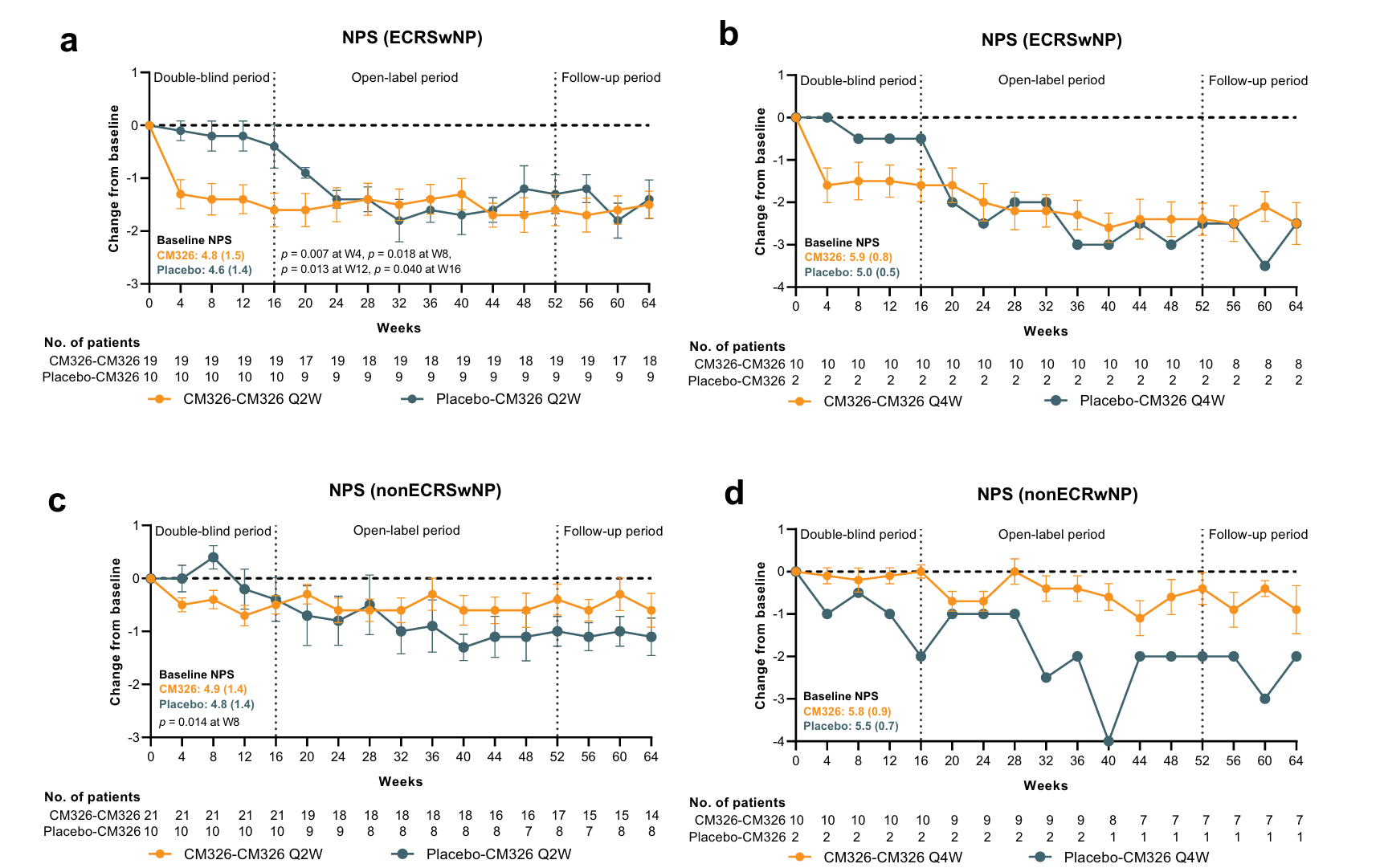 疗效结果显示,在主要终点方面,Q2W组ECRSwNP患者接受CM326治疗后第16周NPS较安慰剂组显著改善,平均差值为-1.2(95%置信区间-2.3至-0.1,P=0.04),且该改善自首次评估(第4周)起即显现并持续至开放标签期和随访期;而Q4W组ECRSwNP患者中CM326与安慰剂的NPS变化平均差值为-1.1(95%置信区间-3.1至0.9,P=0.24),无统计学意义。在nonECRSwNP患者中,无论Q2W或Q4W组,均未观察到NPS的显著改善。探索性疗效分析表明,持续使用CM326的ECRSwNP患者其NPS改善得以维持,从安慰剂切换至CM326的患者亦迅速呈现类似改善,且疗效在治疗中止后12周内仍持续;相比之下,nonECRSwNP患者即使延长CM326治疗亦无NPS降低。