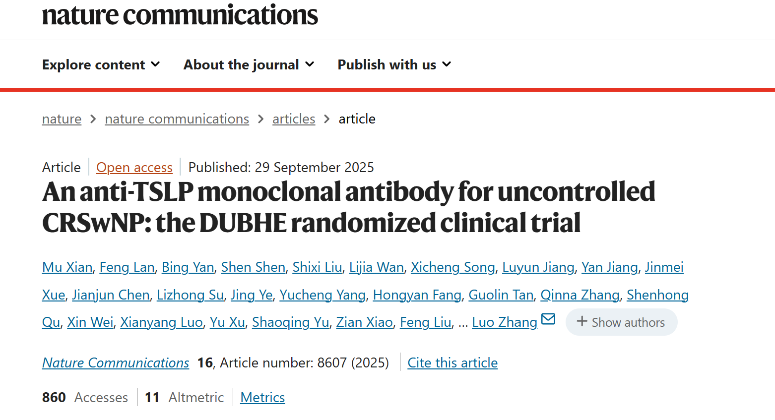 Xian, M. et al. An anti-TSLP monoclonal antibody for uncontrolled CRSwNP: the DUBHE randomized clinical trial. Nat. Commun. 16, 8607 (2025).