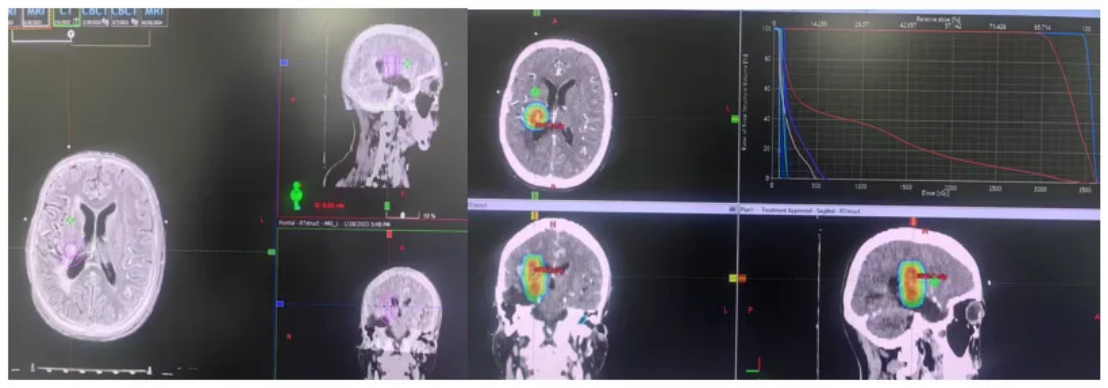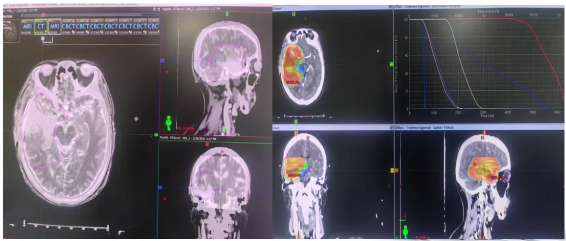 2023-3-28至2023-4-13脑部再程放疗:采用调强适形放疗(IMRT)。GTV(脑肿瘤灶):35Gy/10f,CTV(GTV周围亚临床病灶) 30Gy/10f。每天1次,2周完成(图6)。