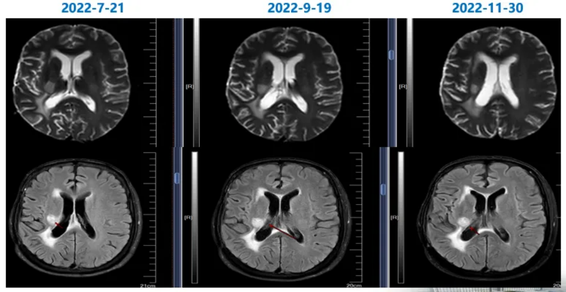 2022-9-19脑部MRI随访复查:右侧颞叶胶质瘤术后,右侧额叶侧脑室前角旁结节,右侧基底节区后部片状异常信号,较前(2022-7-1)强化程度减低;右侧脑室周围及胼胝体压部缺血灶,较前片相仿;右侧额颞部少许硬膜下积液,较前稍吸收;右侧基底节区陈旧性腔梗灶(图5)。