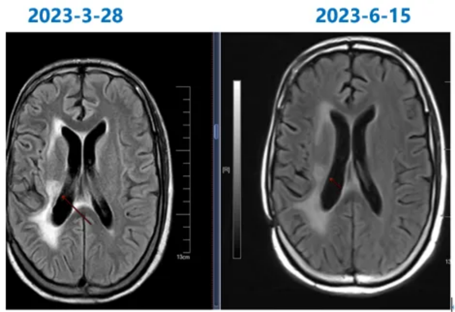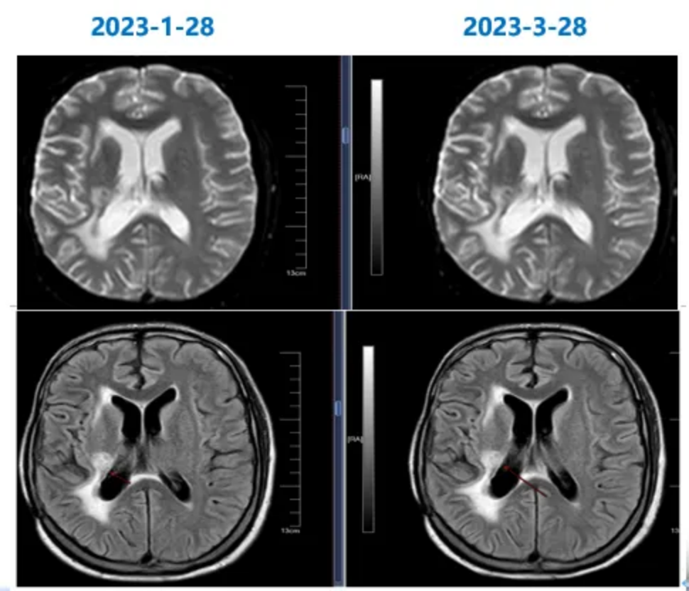 2023-3-28脑部MRI随访复查:右侧颞叶胶质瘤术后;右侧基底节区后部片状异常信号,较前(2023-1-28)范围基本相仿,建议定期复查;右侧侧脑室周围及胼胝体压部缺血灶;右侧基底节区陈旧性腔梗灶(图5)。