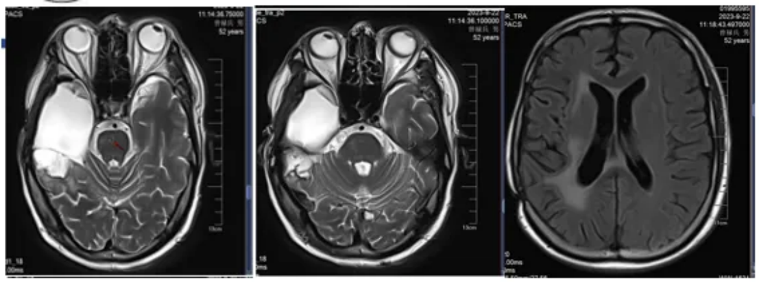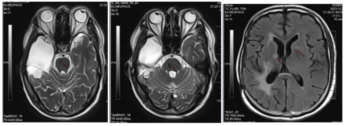 2023-12-29脑部MRI随访复查:右侧颞叶胶质瘤术后;右侧基底节区后部点状异常信号,较前(2023-09-22)相仿,建议定期复查;右侧大脑脚华勒氏变性;桥脑小片状异常信号,较前增大,软化灶并含铁血黄素沉积?转移待排;右侧侧脑室边缘及左侧基底节异常信号,急性腔梗可能,较前新发,随诊复查;右侧侧脑室周围缺血灶;右侧基底节区陈旧性腔梗灶;两侧筛窦炎(图8)。