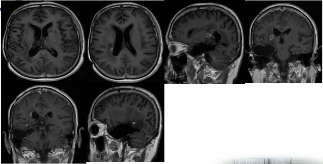 2022-7-1颅脑MRI平扫+增强:右侧额叶侧脑室前角旁可见结节状稍长T1长T2信号影,直径约7mm,DWI呈等低信号,增强后可见强化。另右侧基底节区后部可见稍长T1长T2信号影,直径约15mm,DWI呈高信号,增强后可见不均匀轻度强化(图4)。诊断:右侧颞叶胶质瘤术后,右侧额叶侧脑室前角旁结节,右侧基底节区后部片状异常信号,较前(2022-3-19)新发,结合病史考虑转移可能。右侧脑室周围及胼胝体压部缺血灶,较前片相仿;右侧额颞部少许硬膜下积液,较前稍吸收;右侧基底节区陈旧性腔梗灶。