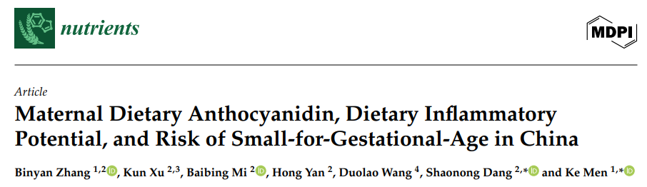 Zhang, B.; Xu, K.; Mi, B.; Yan, H.; Wang, D.; Dang, S.; Men, K. Maternal Dietary Anthocyanidin, Dietary Inflammatory Potential, and Risk of Small-for-Gestational-Age in China. Nutrients 2025, 17, 3187. https://doi.org/10.3390/nu17203187