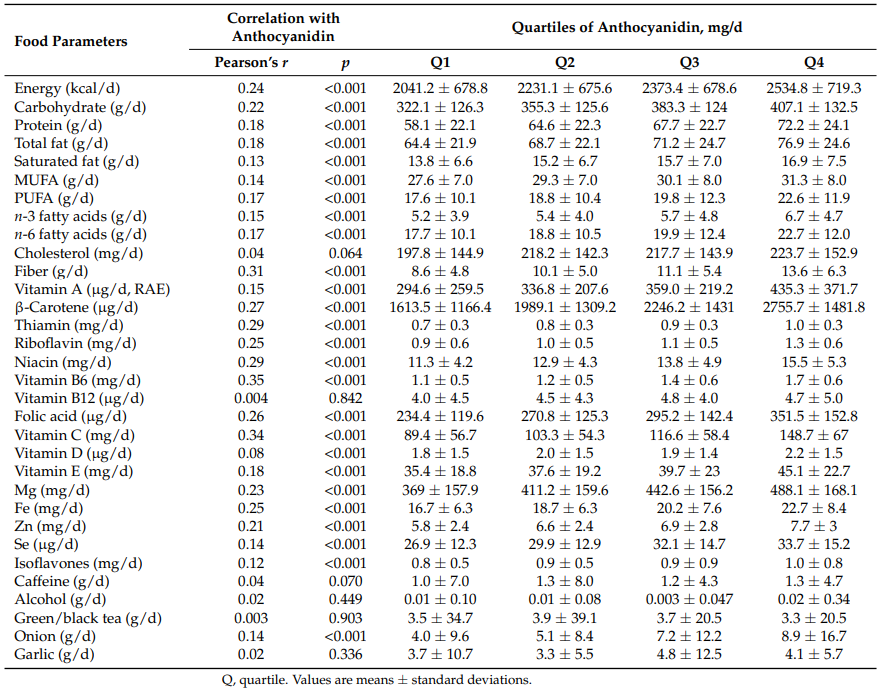 表:食物参数与花青素摄入量的相关性及其在花青素分位区间中的分布特征