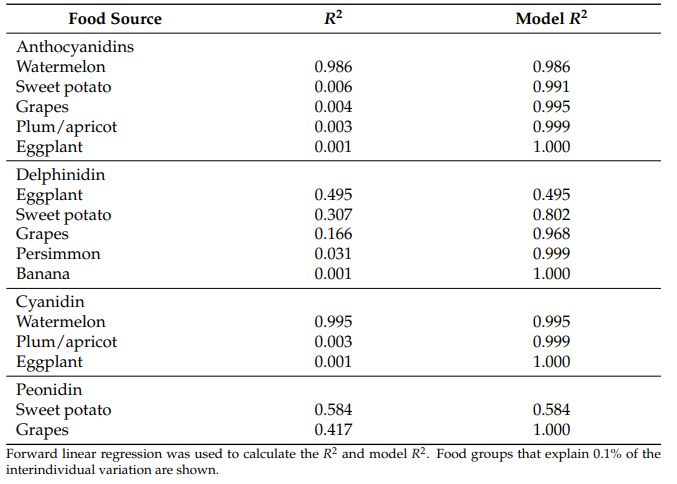 表:2015–2019年间,通过食物来源解释中国孕妇花青素摄入量的个体间变异