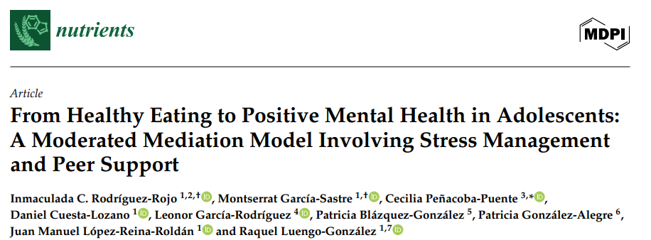 Rodríguez-Rojo, I.C.; García-Sastre, M.; Peñacoba-Puente, C.; Cuesta-Lozano, D.; García-Rodríguez, L.; Blázquez-González, P.; González-Alegre, P.; López-Reina-Roldán, J.M.; Luengo-González, R. From Healthy Eating to Positive Mental Health in Adolescents: A Moderated Mediation Model Involving Stress Management and Peer Support. Nutrients 2025, 17, 3305. https://doi.org/10.3390/nu17203305