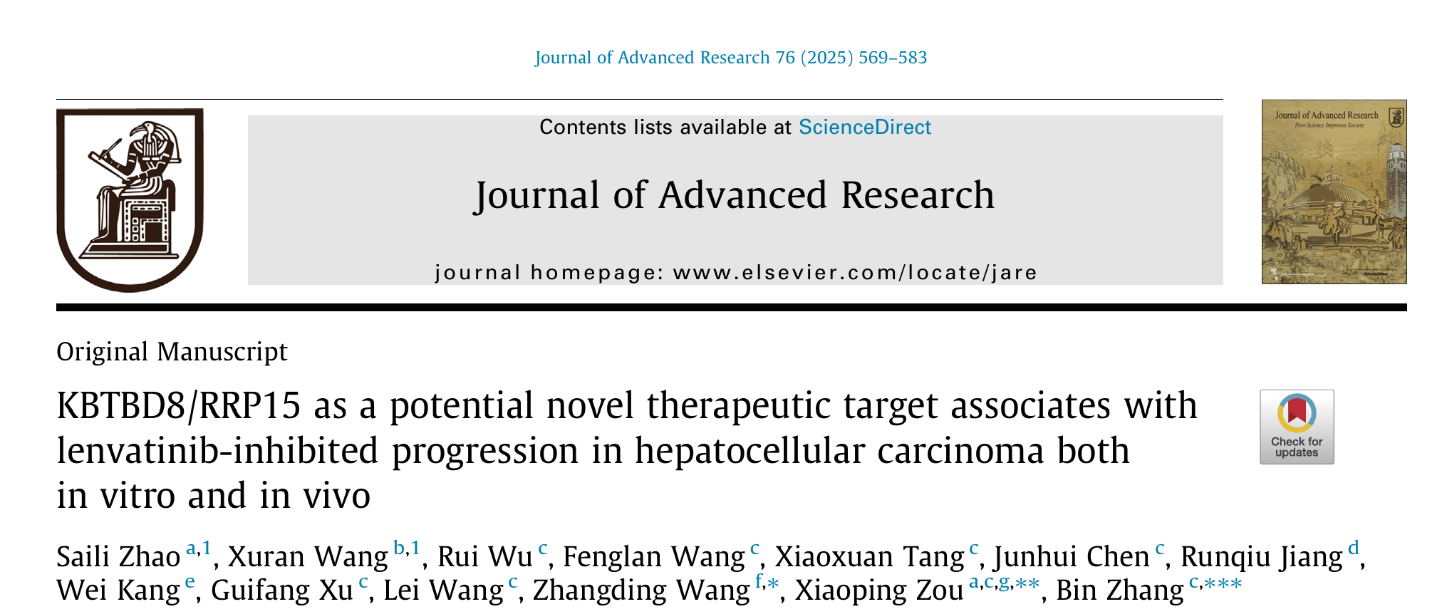 Zhao, S., Wang, X., Wu, R., Wang, F., Tang, X., Chen, J., Jiang, R., Kang, W., Xu, G., Wang, L., Wang, Z., Zou, X., & Zhang, B. (2025). KBTBD8/RRP15 as a potential novel therapeutic target associates with lenvatinib-inhibited progression in hepatocellular carcinoma both in vitro and in vivo. Journal of Advanced Research, 76, 569-583. https://doi.org/10.1016/j.jare.2024.12.017