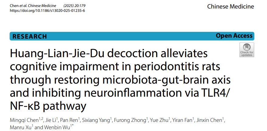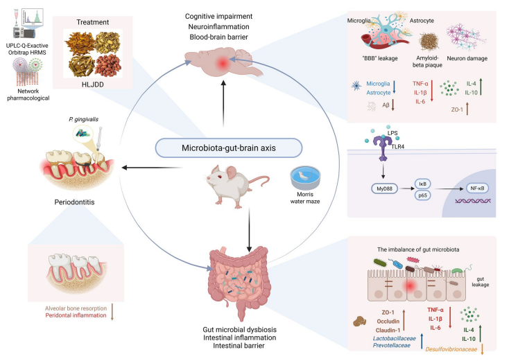 近期,发表于Chinese Medicine的一项研究,正是围绕这个主题展开。来自成都中医药大学研究团队发现,黄连解毒汤不仅能缓解牙周炎,还能通过调控“肠-脑轴”,抑制神经炎症,显著改善认知功能。