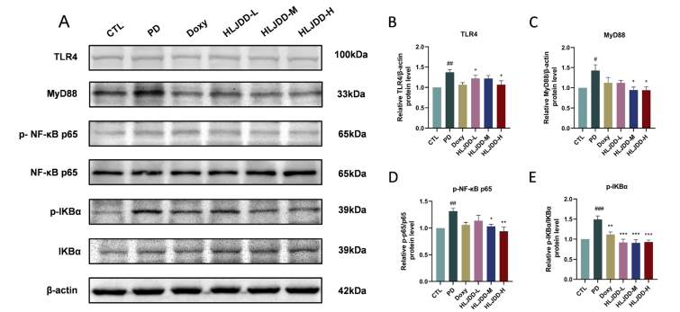 HLJDD能显著降低海马体中 TLR4、MyD88、p-NF-κB p65、p-IκBα 等关键蛋白的表达,从而抑制神经炎症 cascade 的启动。