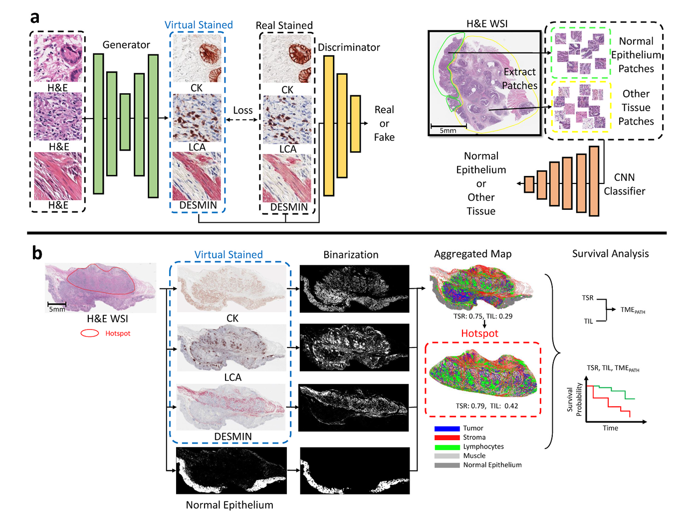 在深度学习框架构建方面,研究采用了注意力门控生成对抗网络进行虚拟染色,并利用EfficientNet-B3模型进行正常上皮分类。生成器网络采用对称编码器-解码器结构,通过注意力门控机制突出空间特征,提升染色定位准确性;判别器则负责区分真实与虚拟免疫组织化学图像。损失函数结合平滑L1损失、结构相似性损失和二元交叉熵损失,并特别引入了DAB通道特异性损失以增强染色特征学习。模型训练过程中应用了随机旋转、缩放、翻转和高斯模糊等图像增强技术,并针对不同染色模式优化损失权重。图像配准通过全局与局部两步法实现,确保H&E与免疫组织化学图像在像素级对齐。基于虚拟染色输出的组织区域,研究进一步计算了肿瘤-基质比和肿瘤浸润淋巴细胞比例,其中肿瘤-基质比定义为基质面积占肿瘤与基质面积之和的比例,肿瘤浸润淋巴细胞比例则为淋巴细胞面积占肿瘤与基质面积之和的比例。