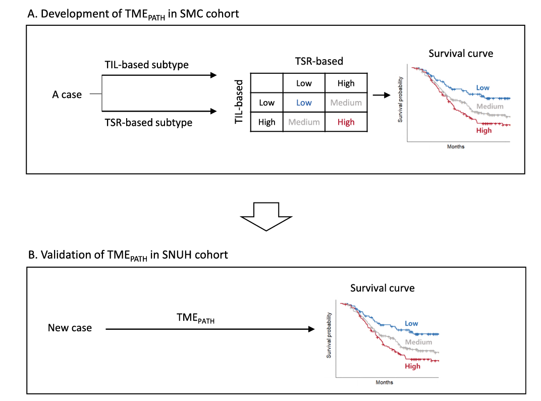 预后分析结果显示,肿瘤-基质比亚型在三星医疗中心队列中与总生存期显著相关,高风险组死亡风险比为1.430,一致性指数为0.531;在外部验证队列中虽未达统计学显著性,但趋势一致。肿瘤浸润淋巴细胞亚型在外部队列中表现更佳,高风险组死亡风险比为1.691,一致性指数为0.564。整合性生物标志物TMEpATH在内外部队列中均显著分层患者预后,三星医疗中心队列中中风险与高风险组相对于低风险组的死亡风险比分别为1.281和1.768,一致性指数为0.545;首尔国立大学医院队列中相应风险比分别为1.389和2.435,一致性指数为0.579。此外,TMEpATH在预测无复发生存方面也表现出一定能力,内外部队列的受试者工作特征曲线下面积分别为0.561和0.587,提示其可能作为化疗反应的辅助预测指标。