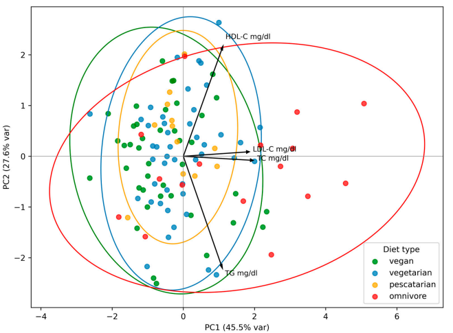 该项横断面研究共纳入128名健康波兰女性,所有参与者年龄相近、体重指数(BMI)正常(18.50–24.99 kg/m²)且体脂率无显著差异。参与者根据其饮食习惯被分为四组:严格素食者(VEG, n=45)、乳蛋素食者(LOV, n=52)、鱼素者(PSC, n=12)及杂食者(OMN, n=19)。研究通过7天饮食记录评估营养摄入,采用酶法试剂盒测定空腹血清脂质谱,并利用物理活动水平(PAL)指数评估身体活动情况。统计方法包括方差分析、主成分分析(PCA)以及多元线性回归分析,以控制潜在混杂因素。