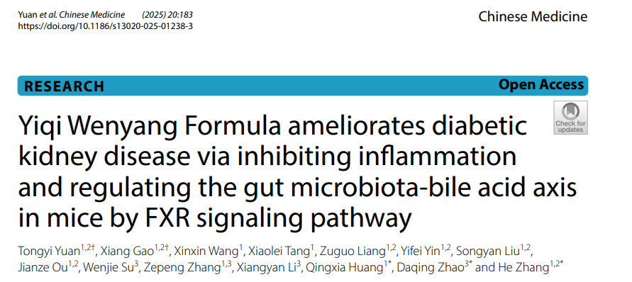 Yuan, T., Gao, X., Wang, X. et al. Yiqi Wenyang Formula ameliorates diabetic kidney disease via inhibiting inflammation and regulating the gut microbiota-bile acid axis in mice by FXR signaling pathway. Chin Med 20, 183 (2025). https://doi.org/10.1186/s13020-025-01238-3