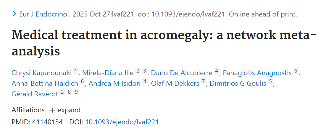 Chrysi Kaparounaki, Mirela-Diana Ilie, Dario De Alcubierre, Panagiotis Anagnostis, Anna-Bettina Haidich, Andrea M Isidori, Olaf M Dekkers, Dimitrios G Goulis, Gérald Raverot, Medical treatment in acromegaly: a network meta-analysis, European Journal of Endocrinology, 2025;, lvaf221, https://doi.org/10.1093/ejendo/lvaf221
