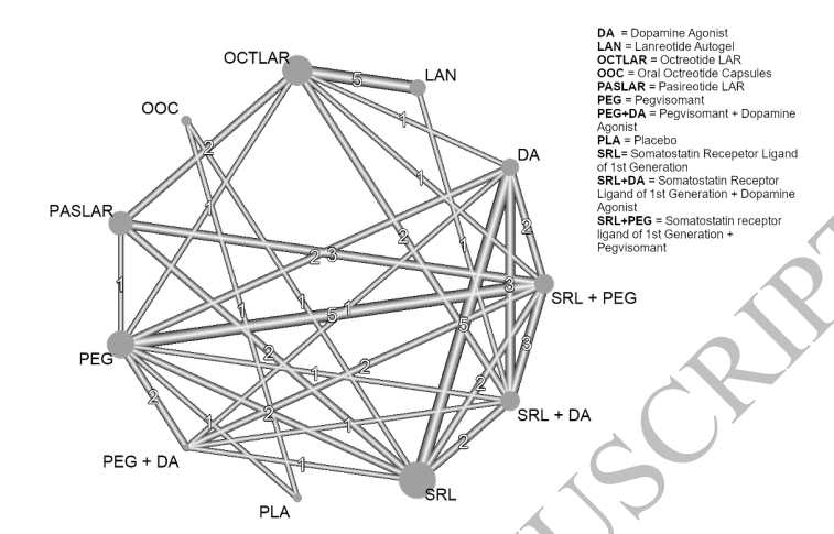 肢端肥大症是一种罕见的慢性疾病,通常由分泌生长激素的垂体腺瘤引起。其管理依赖于手术、药物治疗和放疗的综合策略。尽管手术是首选一线治疗,但许多患者需要长期药物治疗以控制疾病活动。目前,一代生长抑素受体配体(如奥曲肽长效释放制剂和兰瑞肽)是标准药物治疗,但生化缓解率有限(约30%-55%)。随着新药如帕瑞肽长效释放制剂、培维索孟和口服奥曲肽胶囊的出现,治疗选择日益丰富。然而,由于疾病罕见,头对头随机对照试验缺乏,限制了直接比较证据。网络荟萃分析通过整合直接和间接证据,为治疗比较提供了新途径。
