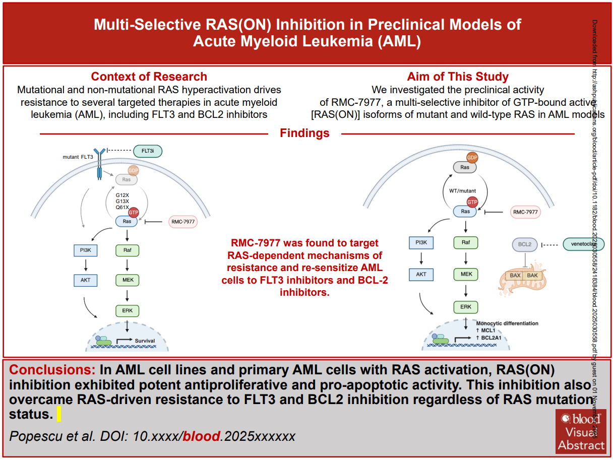 Popescu B, Jones MF, Piao M, Tran E, Koh A, Lomeli I, Peretz CAC, Murad N, Abelson S, Morales CE, Rivera JM, Batingana AR, D'Souza J, Pikman Y, Cheng ML, Logan AC, Huang BJ, Stieglitz E, Smith CC. Multiselective RAS(ON) inhibition targets oncogenic RAS and overcomes RAS-mediated resistance to FLT3i and BCL2i in AML. Blood. 2025 Oct 27:blood.2025030558. doi: 10.1182/blood.2025030558. Epub ahead of print. PMID: 41144772.