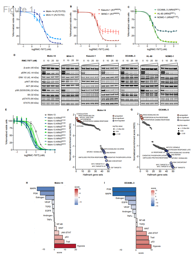 结果显示,RMC-7977在携带MAPK激活信号突变的AML细胞系中表现出纳摩尔级的强效抗增殖活性,同时显著抑制ERK和部分AKT磷酸化,提示其有效阻断RAS驱动的MAPK和PI3K信号通路。 在诱导表达不同KRAS/NRAS突变的同系细胞中,RMC-7977均表现出一致的抑制效果,证明其广谱靶向活性。